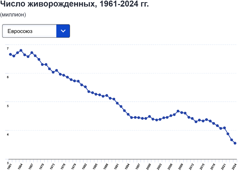 2. Суммарный коэффициент рождаемости (СКР) снизился до 1,34 (для воспроизводства населения нужен СКР = 2,2). В 2023 году СКР был 1,38, а обвал с 2015 года - 13%. Лидеры в ЕС по высокому СКР: Болгария - 1,72, Франция - 1,61, Словения - 1,52. Самый низкий: Мальта - 1,01, Испания - 1,1 ... Читать дальше » |
