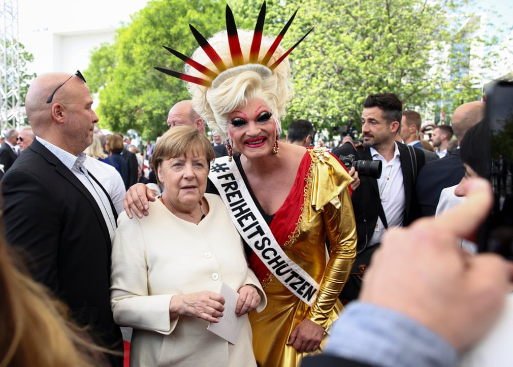 Сегодня немцы празднуют 75-летие конституции Германии, которая была принята 23 мая 1949 года после одобрения оккупационного режима США, Британии и Франции (Тризония), этот же день считается датой основания Федеративной республики Германия. Уличные мероприятия праздника посетил бывший канцлер ФРГ Ангела Меркель, полюбуйтесь с кем она фотографировалась (Гардиан внёс этот снимок в свой сборник "Фото дня").