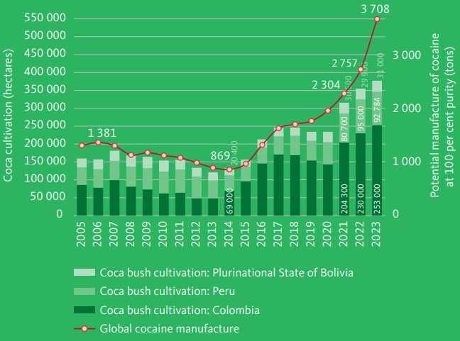 2. Главный производитель фентанила это Мексика, прекурсоров для него и оборудования - Китай. Если в Венесуэле и производится фентанил, то это ничтожные количества, даже Трамп не упоминает её как источник. 3. Согласно данным ООН, в Венесуэле коку не выращивают и кокаин не производят; в организации заявили, что страна сертифицирована как "свободная территория от посевов наркосодержащих культур и производства наркотиков". Поля с кокой и кокаин это Колумбия, Перу и Боливия.