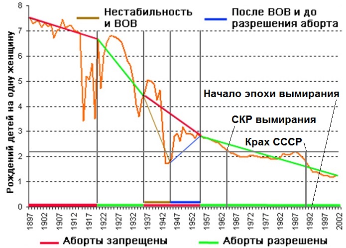 В обывательской среде достаточно широко циркулирует устойчивый миф о том, что первый враг высокой рождаемости это капитализм. С точки зрения пропаганды социализма, он весьма полезный, но вот к истине никакого отношения не имеет. 1. В капиталистической Российской Империи СКР был около 5-7. 2. СКР упал ниже уровня воспроизводства в 1964 году при социалистическом СССР. Те времена характеризуются полным восстановлением ущерба от европейского вторжения (ВОВ), стабильностью и относительным благополучием широких масс населения. Именно в этот год была заложена эпоха вымирания. Напоминаю. После падения СКР ниже воспроизводства (2,2) численность населения растёт кое-какое время за счёт демографической инерции, время которой зависит от множества параметров и может составлять 10-50 лет. По исчерпания демографической инерции, неизбежно начинается депопуляция.