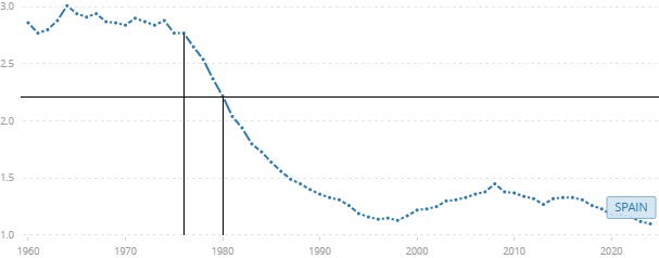 На основании вышеприведённого графика СКР выделю три этапа современной демографической истории Испании. Первый этап: 1939-1975 годы - высокая рождаемость (одна из самых больших в Европе), государственный натализм, сильная власть католической церкви и националистического правительства Франсиско Франко, патриархальность, женщины исполняют традиционную роль (семья, дети), аборты и противозачаточные запрещены. Второй этап: 1976-1981 годы - отмена наталистской политики, переход к демократии и либерализму, гражданский и государственный феминизм, гниение патриархата, легализация контрацепции, обвал рождаемости до уровня воспроизводства (СКР = 2,2). Третий этап: 1982-настоящие годы - предыдущий этап отягощается факторами второго демографического перехода [5], либерализация абортов и рост их числа, феминизм приобретает радикальный характер, очень низкая рождаемость на уровне вымирания, естественная убыль населения, снижение численности лиц в возрасте до 25 лет. Во время эпохи правления Франсиско Франко (1939-1975) женщины рассматривались как основа испанской семьи, цели их жизни понимались как замужество, дом, домохозяйство и деторождение. Существовала женская культура домашнего очага и общественная норма, согласно которой после замужества женщина бросает работу и посвящает себя семье. Право женщин на труд ограничивалось: вредное и сложное производство, юрист, врач, дипломат, судья, брокер, некоторые виды спорта, разрешение супруга для различных видов деятельности. Аборты, противозачаточные и разводы запрещены, у женщин нет избирательного права. Закон от 1941 года предусматривал тюремное заключение и штраф за пропаганду контрацептивов, любую форму распространения методов или практик, направленных на предотвращение деторождения. При Франко аннулировали равенство между законными и внебрачными детьми. Преследовалось прелюбодеяние и сожительство вне брака. Введено раздельное обучение мальчиков и девочек. В целом правительство Франко реализовало наталистскую политику и решало существовавший до него "кризис семьи" [6]. Поддерживались строгие стандарты женственности и консерватизм в женской одежде. Предусматривались выплаты семьям за каждого ребёнка, финансово стимулировалось рождение вторых детей, были вознаграждения и скидки на различные услуги для многодетных семей. С целью поддержки многодетности ввели систему перераспределения дохода. Проводилась активная семейная политика и пропагандистская кампания в пользу традиционной и многодетной семьи. Наиболее очевидными проявлениями кризиса испанской семьи были снижение рождаемости (которое стало систематическим в начале 20-го века в результате начала демографического перехода [5]) и увеличение оплачиваемого труда матерей вне дома. Оплачиваемый труд замужних женщин подрывал функциональность семьи, вынуждал мать отказываться от домашних дел, детей и супруга (уделять им меньше времени), а значит, женщина теряла свою социальную функцию. Примечательно, что до прихода Франко с ним боролось организованное феминистическое движение, насчитывающее около 60 тыс. женщин (многие участвовали в вооружённой борьбе), их называли "красные шлюхи" (red whores) [7]. После смерти Франко власть захватили демократы и либералы, они отказались от политики стимуляции рождаемости, провели директивную феминизацию ис
