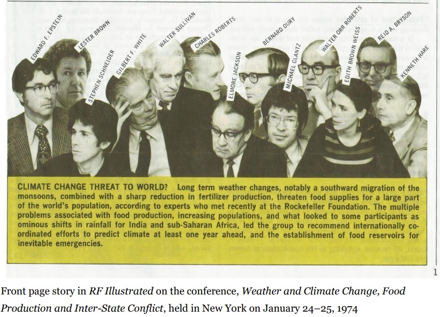 14 ноября 1972 года Комитет «Война и мир» опубликовал доклад, в котором подчеркивалось, что традиционные подходы к международным отношениям, разделяющие национальные и международные вопросы, больше не являются эффективными. Также в документе говорилось: рост интереса молодёжи к защите окружающей среды показывает готовность сосредоточиться на планетарных проблемах; многие молодые лидеры ясно дают понять, что идеализм, энергия и преданность делу должны сочетаться с профессионализмом, терпением и способностью решать угрозы глобализированного мира. Получив одобрение руководства Фонда Рокфеллера в 1973 году, штатный консультант Фонда Элмор Джексон быстро приступил к работе над воплощением в жизнь нового направления деятельности организации, сосредоточившись на климатических проблемах. Он организовал конференцию под названием «Погода и изменение климата, производство продуктов питания и межгосударственные конфликты», она прошла в Нью-Йорке 24-25 января 1974 года. Конференция рекомендовала создавать «продовольственные резервы» и призвала к «совместным усилиям в области прогноза изменения климата как минимум на год вперёд». Об этом мероприятии написала газета «Нью-Йорк Таймс». Всемирный банк запросил пятьдесят экземпляров отчёта конференции для распространения среди исполнительных директоров и старших сотрудников, также его копии получили Рэнд** и Национальное управление океанических и атмосферных исследований.